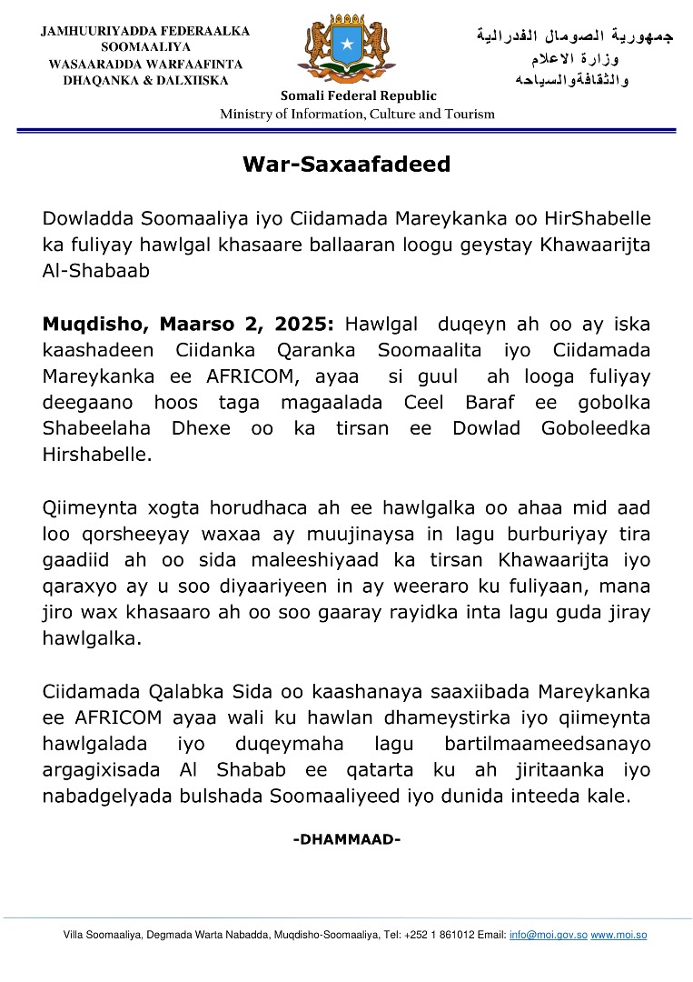 Dowladda Soomaaliya ayaa warsaxaafadeed ka soo saartay hawlgal ka dhan ah Al-shabaab oo ay wada fuliyeen Dowladda Soomaaliya iyo Ciidamada Mareykanka, kaas oo ay ka fuliyeen HirShabelle.