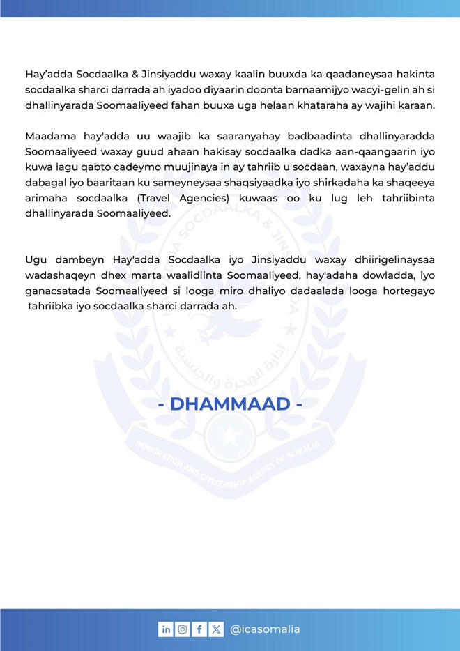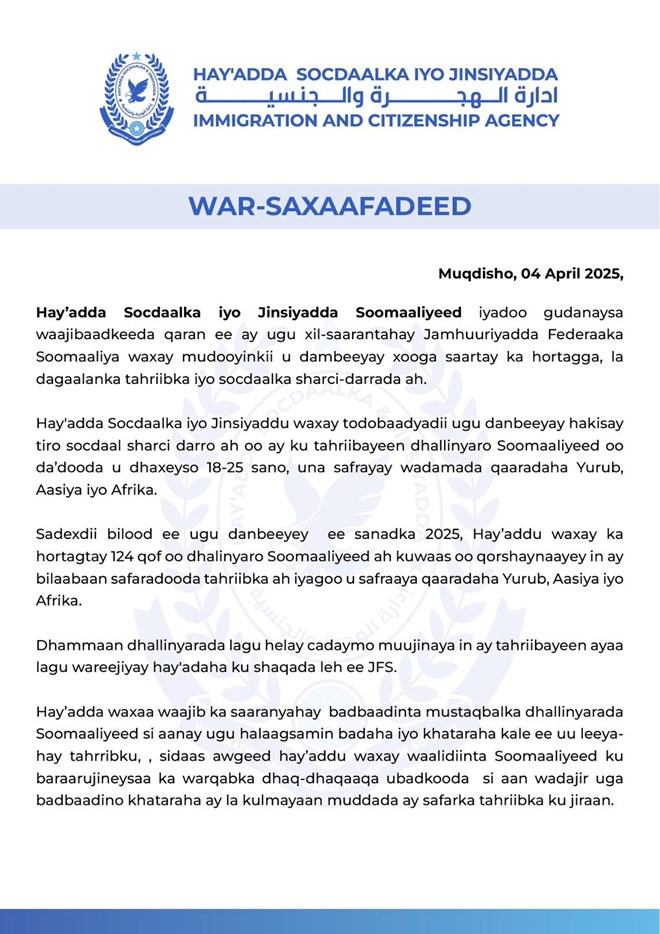 Hay’adda Socdaalka iyo Jinsiyadda ayaa waxa ay todobaadyadii ugu danbeeyay hakisay tiro socdaal sharci darro ah oo ay ku tahriibayeen dhallinyaro Soomaaliyeed oo da’dooda u dhaxeyso 18-25 sano, una safrayay wadamada qaaradaha Yurub, Aasiya iyo Afrika.