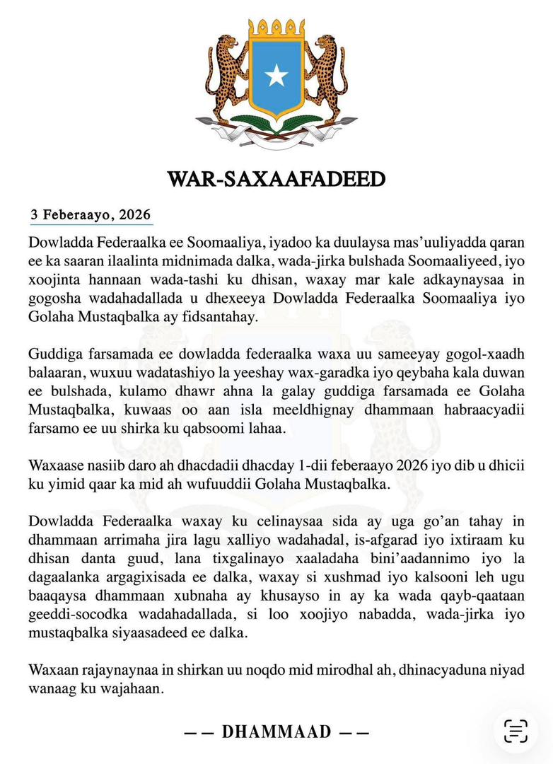 Dowladda Soomaaliya waxay mar kale ku celisay in gogosha wadahadalku ay weli fidsan tahay, iyadoo si gaar ah ugu baaqday madaxda Maamullada Puntland iyo Jubbaland in ay yimaadaan magaalada Muqdisho si loo amba-qaado geeddi-socodka nabadda iyo dhismaha mustaqbalka siyaasadeed ee dalka.