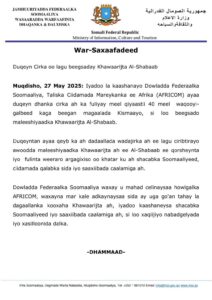 War-saxaafadeed ka soo baxay Dowladda Federaalka Soomaaliya ayaa lagu xaqiijiyay duqeynta, iyada oo sheegtay in lala beegsaday xubno ka tirsan AS.