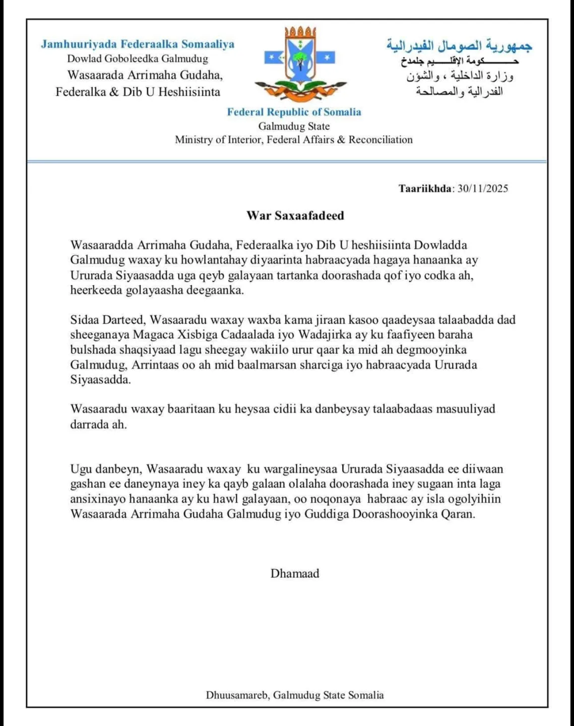 Qaraal ka soo baxay wasaaradda arrimaha gudaha Galmudug ayaa lagu sheegay in ay waxba kama jiraan yihiin dadka sheeganaya magaca xisbiga Caddaaladda iyo Wadajirka ee wakiilada ugu magacaaban qaar ka mid ah degmooyinka Galmudug.