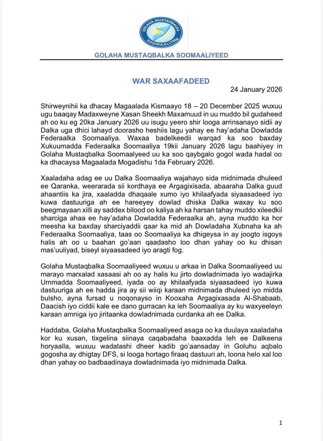 “Golaha Mustaqbalka Soomaaliyeed asaga oo ka duulaya xaaladaha kor ku xusan, tixgelina siinaya caqabadaha baaxadda leh ee Dalkeena horyaalla, wuxuu wadatashi dheer kadib go’aansaday in Goluhu aqbalo gogosha ay dhigtay DFS, si looga hortago firaaq dastuuri ah, loona helo xal loo dhan yahay oo badbaadinaya dowladnimada iyo midnimada Dalka” ayaa lagu yiri Warsaxaafadeedka Golaha Mustaqbalka Soomaaliyeed.