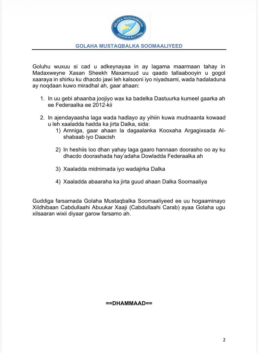 Kulamo saacado qaatay kaddib waxaa Warsaxaafadeed soosaaray Golaha Mustaqbalka Soomaaliyeed oo sheegay in uu aqbalay Gogosha Dowladda Federaalka Soomaaliya ay dhigtay si ay uga wadahadlaan xaaladda Dalka.