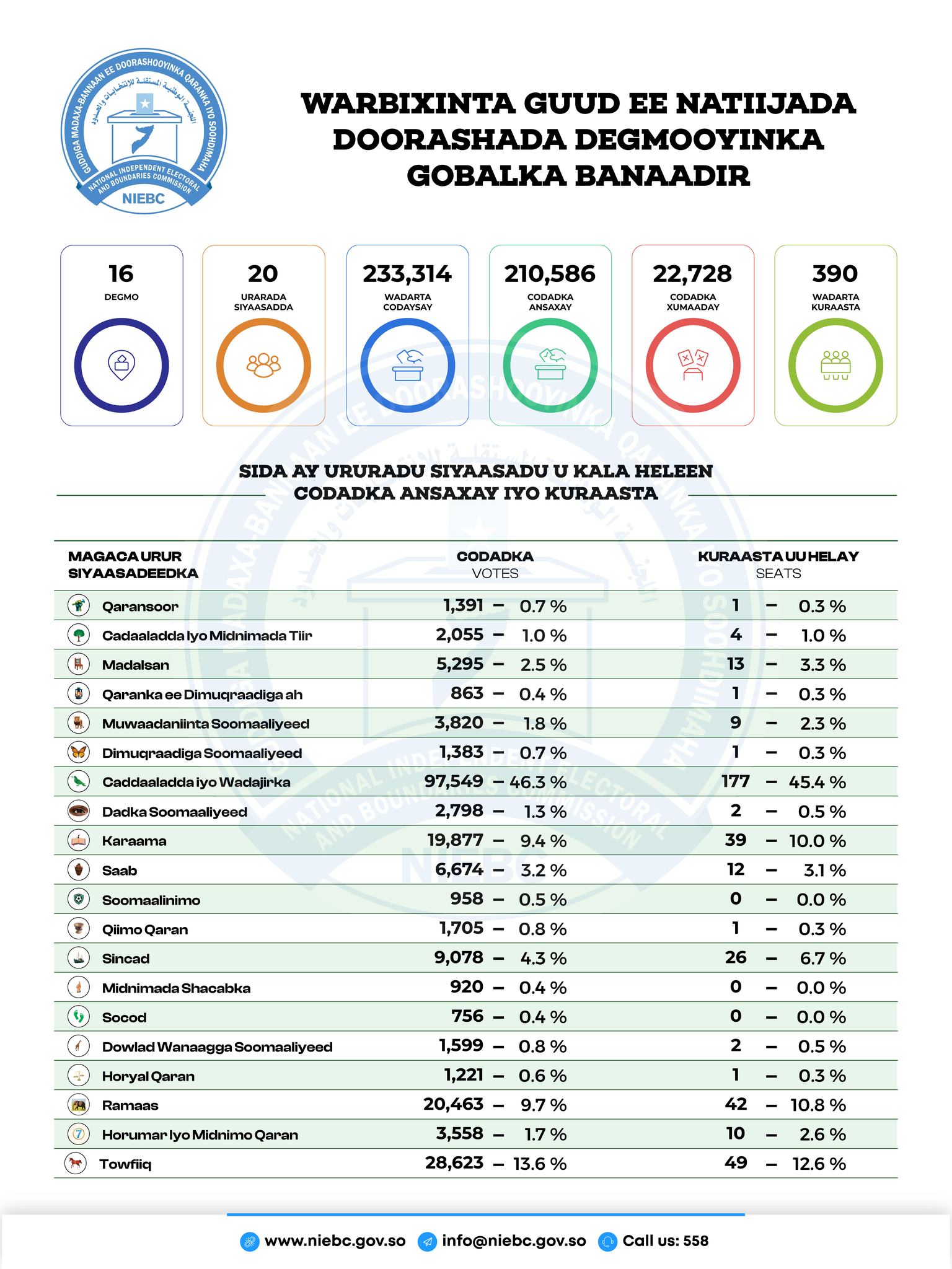 Guddiga Madaxabannaan ee Doorashooyinka Qaranka ayaa xalay ku dhawaaqay natiijada kuraasta lagu tartamay ee Degmooyinka Gobolka Banaadir sida ay u kala heleen 20 Urur siyaasadeed oo musharrixiinta wadatay.