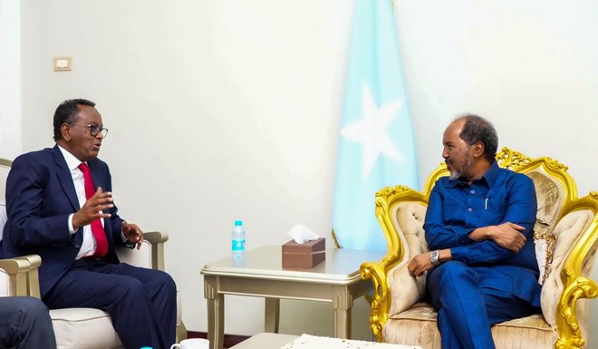 Madaxweynaha Soomaaliya Xasan Sheekh Maxamuud ayaa Madaxtooyada ku qaabilay Ra’iisul wasaarihii hore ee dalka Cabdi Faarax Shirdoon.