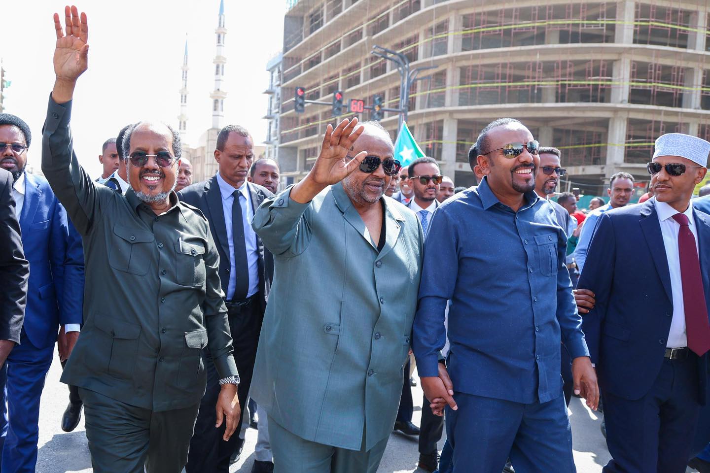 Madaxweynaha Jamhuuriyadda Federaalka Soomaaliya Mudane Xasan Sheekh Maxamuud oo si diirran loogu soo dhaweeyey Garoonka Diyaaradaha Garaad Wiil-waal ee magaalada Jig-jiga ayaa halkaas kulammo kula qaatay Ra’iisul Wasaare Mudane Abiy Axmed iyo Madaxweyne Mudane Ismaaciil Cumar Geelle.