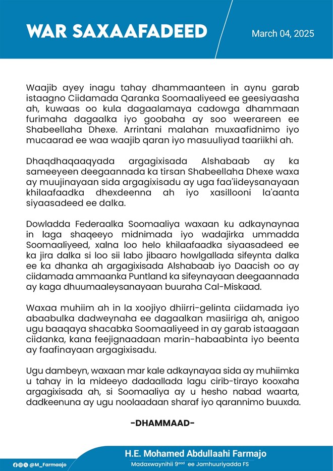 “Waajib ayey inagu tahay dhammaanteen in aynu garab istaagno Ciidamada Qaranka Soomaaliyeed ee geesiyaasha ah, kuwaas oo kula dagaalamaya cadowga dhammaan furimaha dagaalka iyo goobaha ay soo weerareen ee Shabeellaha Dhexe. Arrintani malahan muxaafidnimo iyo mucaarad ee waa waajib qaran iyo masuuliyad taariikhi ah” ayaa lagu yiri Warsaxafadeedka uu soo saaray madaxweyne hore Maxamed Cabdullaahi Farmaajo.