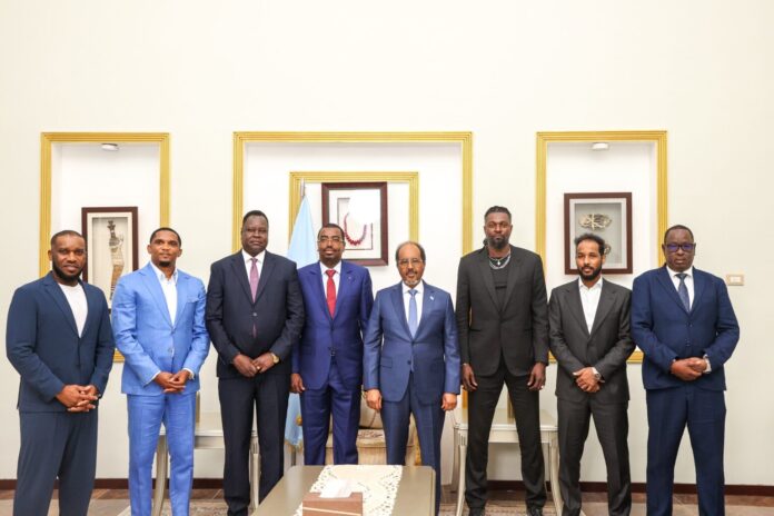 Madaxweynaha Dowladda Federaalka Soomaaliya, Xasan Sheekh Maxamuud ayaa Madaxtooyada ku qaabilay ciyaartoyda caanka ah ee kala ah Samuel Eto’o oo ah Gudoomiyaha Xiriirka Kubadda Cagta Cameroon, Emmanuel Adebayor, iyo Jay-Jay Okocha oo booqasho ku yimid dalka.
