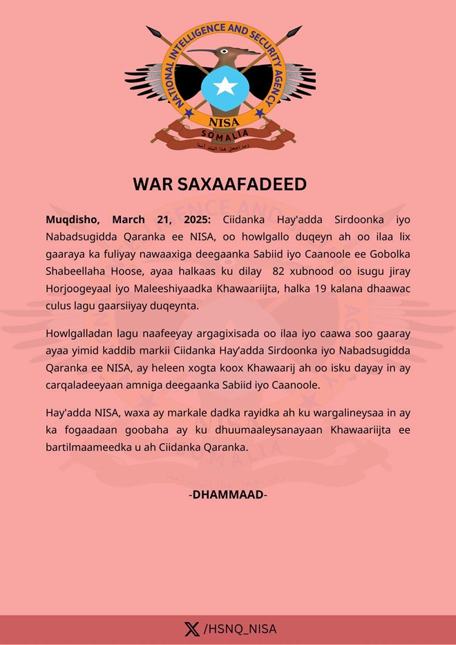 War saxaafadeedka ayaa lagu sheegay in Ciidanka Hay’adda Sirdoonka iyo Nabadsugidda Qaranka ee NISA, oo howlgallo duqeyn ah oo ilaa lix gaaraya ka fuliyay nawaaxiga deegaanka Sabiid iyo Caanoole ee Gobolka Shabeellaha Hoose, ay halkaas ku dileen 82 xubnood oo isugu jiray Horjoogeyaal iyo Maleeshiyaadka Al shabaab, halka 19 kalana dhaawac culus lagu gaarsiiyay duqeynta.