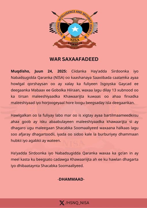 Howlgalkaan ayaa lagu dilay 13 xubnood oo ka tirsan AS sida lagu sheegay warsaxaafadeed ka soo baxay hayadda Sirdoonka iyo Nabadsugidda Qaranka (NISA)