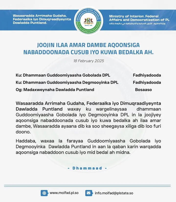 “Wasaaradda Arrimaha Gudaha, Federaalka iyo Dimuqraadiyeynta Dawladda Puntland waxay ku wargelinaysaa dhammaan Guddoomiyaasha Gobolada iyo Degmooyinka DPL in la joojiyey aqoonsiga nabaddoonada cusub iyo kuwa bedalka ah ilaa amar dambe.”