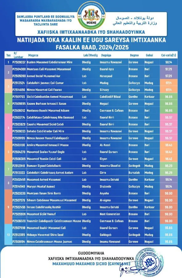 Guud ahaan 10-ka boos ee ugu sarreeya waxaa ka soo muuqday 27 arday oo 17 kamid ah yihiin gabdho, sida ay shaacisay wasaaradda waxbarashada iyo tacliinta Sare ee Puntland.