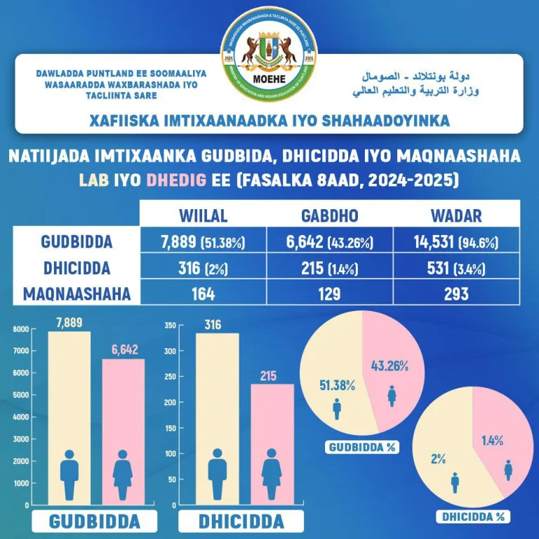 Wasaaradda waxbarashada iyo tacliinta sare ee dowladda Puntland ayaa ku dhawaaqday natiijada imtixaanka shahaadiga ah ee fasalka 8aad sanad dugsiyeedka 2024/25.